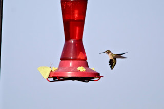 We had a really good flight of American Kestrels and Sharp-shinned hawks on Sunday. There were 123 kestrels and 147 sharp-shins. Some of the birds were really low on this day, providing good views. We also saw a long-tailed Skipper, which isn’t very common on the Eastern Shore. Lately our hummingbird feeder has been attracting more than just hummingbirds. The Cloudless Sulfurs are confusing the hummingbirds by taking their spots on the feeder. In addition to the butterflies, titmice have been visiting them as well! We were finally able to take a photo of the titmice that have been drinking the water from the ant traps above the feeders!